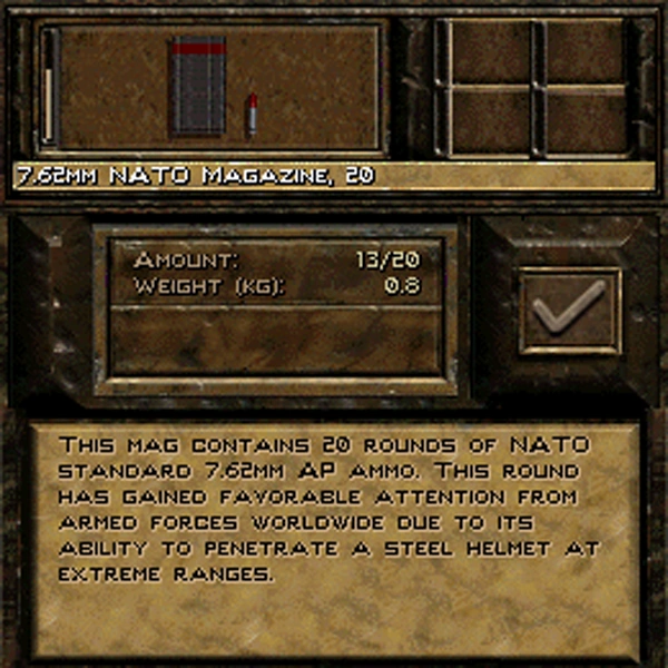 Two 20-round NATO magazines or 30-round WP magazines can be held at smaller inventory slot, while four magazines fit a large inventory slot. Four magazines (two per smaller inventory slots) is sufficient for most combat situations, unless a merc is using a H&K 21.