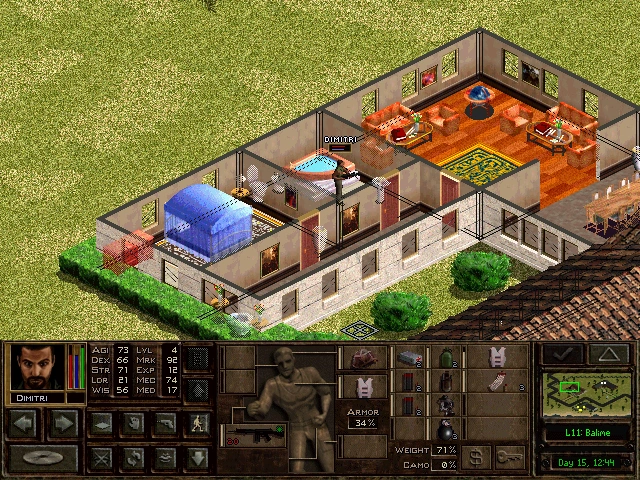 There's a lot of space in Balime compared to other urban environments, so be prepared for house-to-house fighting to be longer range than usual. A scarcity of accessible flat roofs means all vantage points are strictly ground-bound as well. Several enemy soldiers will bunker themselves in the manor house on the southern end, so be cautious when moving around houses, as lethal interrupts can easily be scored on your mercs - even at night - and the doors to the building itself are trapped, preventing a swift, easy entry.