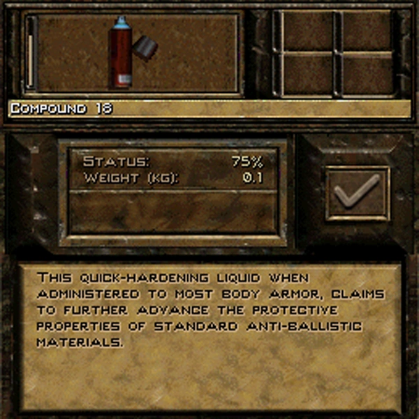 The Compound 18 is an item from Jagged Alliance 2. It is used to improve protection on suits of armor. It is applied on a suit of armor currently worn by a merc using the inventory panel in the Tactical Screen.