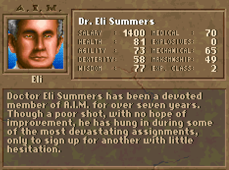 "Doctor Eli Summers has been a devoted member of A.I.M. for over seven years. Though a poor shot, with no hope of improvement, he has hung in during some of the most devastating assignments, only to sign up for another with little hesitation." - Jagged Alliance