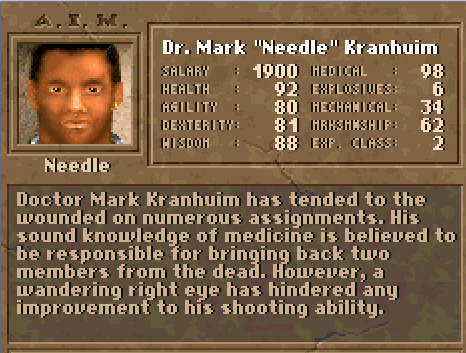 "Doctor Mark Kranhuim has tended to the wounded on numerous assignments. His sound knowledge of medicine is believed to be responsible for bringing back two members from the dead. However, a wandering right eye has hindered any improvement to his shooting ability." - Jagged Alliance