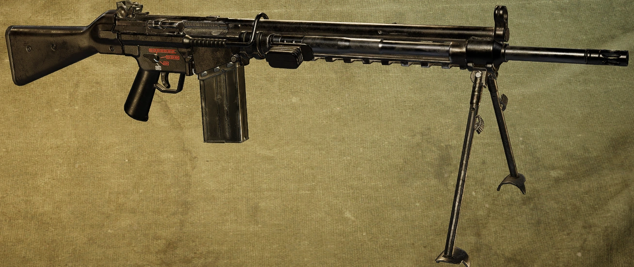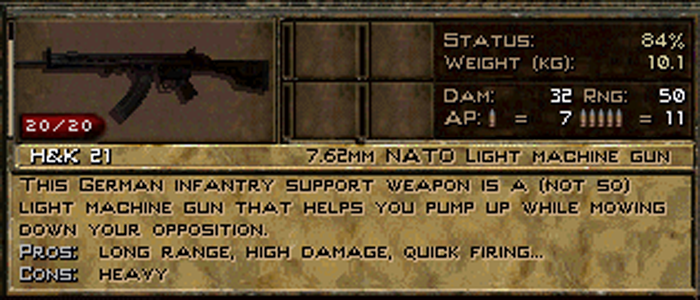 The H&K21 is the heaviest light machine gun available in Jagged Alliance 2. Its hefty weight is compensated by its long range and high damage thanks to its 7.62mm NATO rounds. It is also available in Jagged Alliance 3