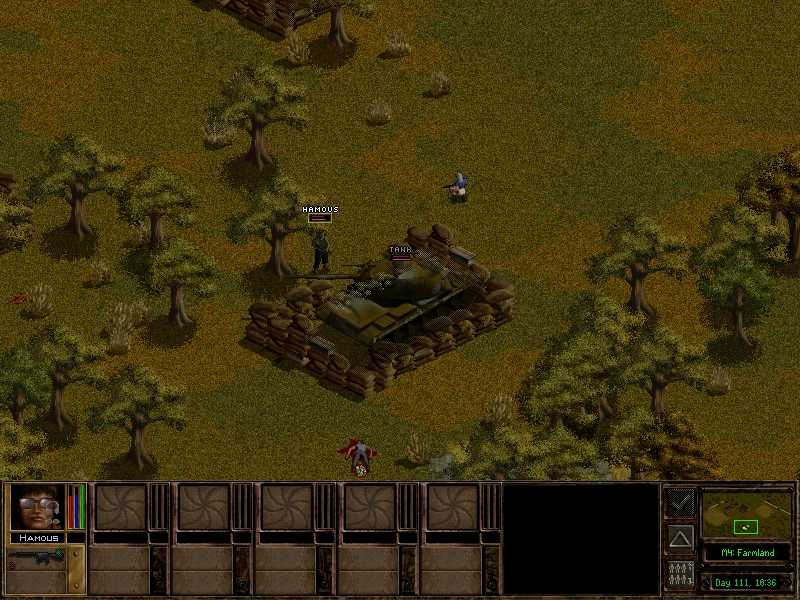 The tank cannot be entered through the Tactical Screen due to the base game seeing the tank as a 'person'. Also due to this reason, if the player chooses to attack the tank (occupied or not), the tank will react the same way the Militia would if they were shot at - by shooting the player's merc with its cannon.