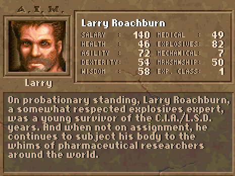 "On probationary standing, Larry Roachburn, a somewhat respected explosives expert, was a young survivor of the C.I.A./L.S.D. years. And when not on assignment, he continues to subject his body to the whims of pharmaceutical researchers around the world."- Jagged Alliance