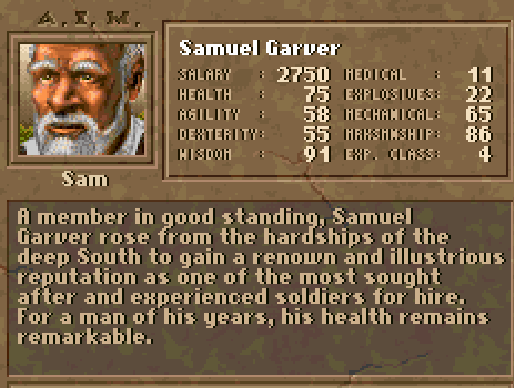 "A member in good standing, Samuel Garver rose from the hardships of the deep South to gain a renown and illustrious reputation as one of the most sought after and experienced soldiers for hire. For a man of his years, his health remains remarkable." - Jagged Alliance, A.I.M. Dossier