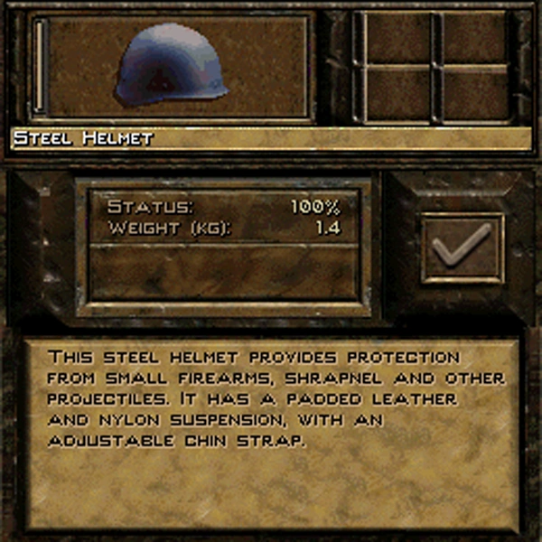 "This steel helmet provides protection from small firearms, shrapnel and other projectiles. It has a padded leather and nylon suspension, with an adjustable chin strap." - Jagged Alliance 2
