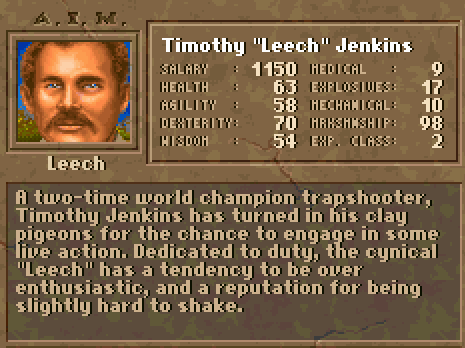 "A two-time world champion trapshooter, Timothy Jenkins has turned in his clay pigeons for the chance to engage in some live action. Dedicated to duty, the cynical Leech has a tendency to be over-enthusiastic, and a reputation for being slightly hard to shake." - Jagged Alliance